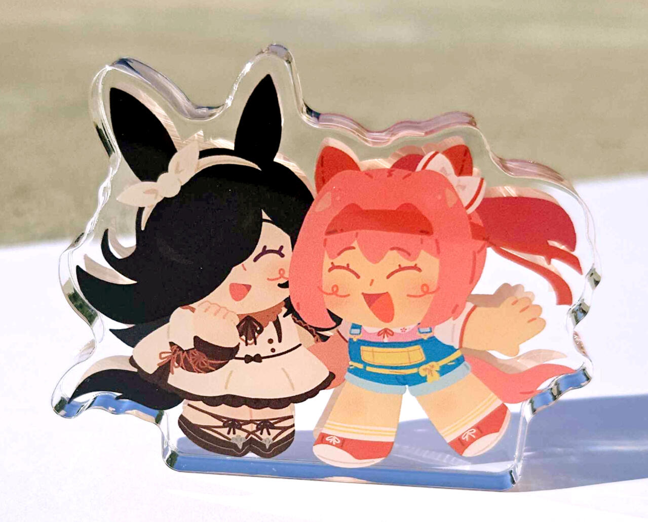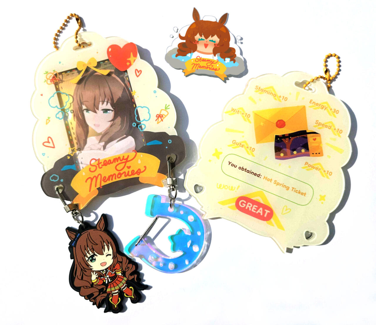 Acrylic, PVC rubber, and embroidered keychains. There's no limit to what kind of materials I will work with! I attach accessories by hand.